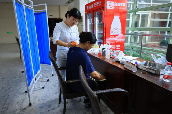 本次活动的最大亮点在于传统中医外治法的体验环节。在专业中医师的指导下,员工们亲身体验了耳穴压豆、肩颈刮痧和拔罐等特色疗法。耳穴压豆通过刺激耳部穴位,帮助调节身体机能,缓解失眠、疲劳等问题;肩颈刮痧针对后勤员工因长期劳作易引发的肩颈酸痛,有效舒筋活络,活血化瘀;拔罐则有助于祛除体内湿寒,缓解肌肉紧张。许多体验者纷纷表示,这些项目针对性强、体验舒适,对中华传统医学的博大精深赞叹不已。