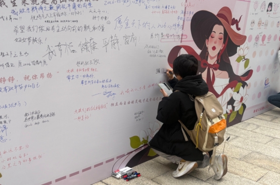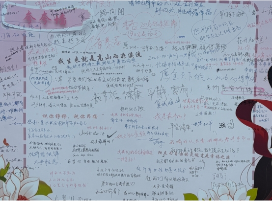 3月6日-8日,由浙江财经大学后勤服务中心公寓管理部主办的「WOMEN 我们说」——三八妇女节特别活动在立潮楼学生公寓的大平台温情启幕。我们没有搭建华丽的舞台,只竖起了一面“夸夸墙”;我们也没有准备冗长的台词,只留下了一句话:“对自己说,对她说,对‘我们’说”。